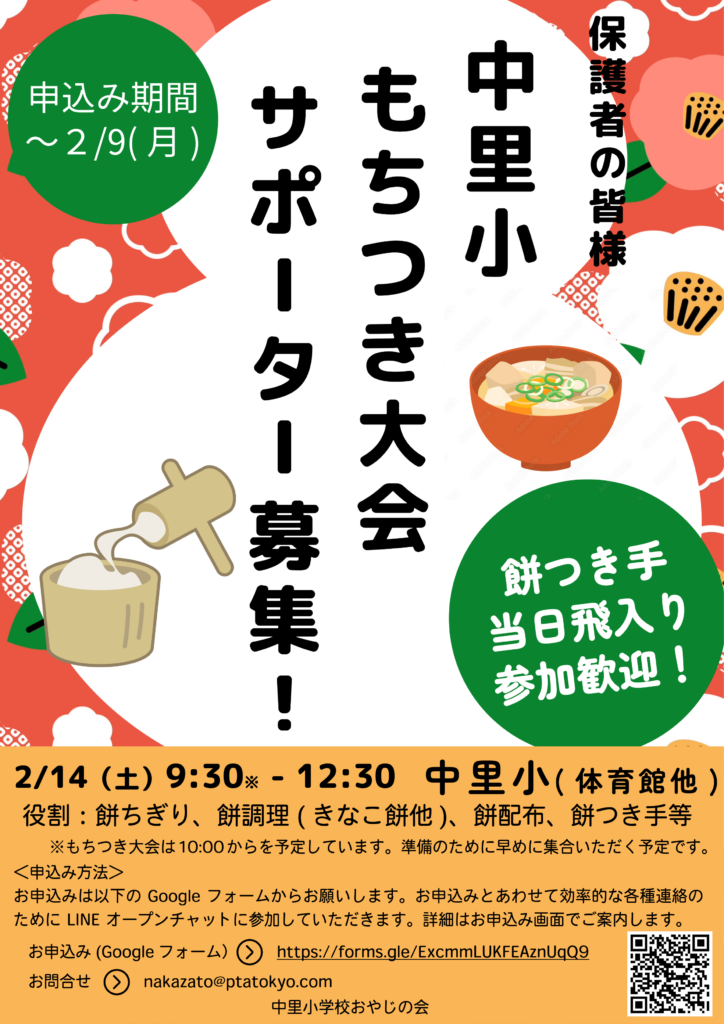 もちつきは力仕事もあるため、お父さん・保護者の皆さんの“つき手”参加も大歓迎です。