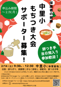 今年も「もちつき大会」を開催します! 子どもたちに、杵と臼でもちをつく“昔ながらの体験”を届けたいと思っています。 昨年ご協力いただいた皆さまから 「サポートが家庭科室中心で、もちつきの様子が見えにくかった」 という声を […]